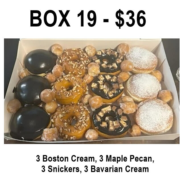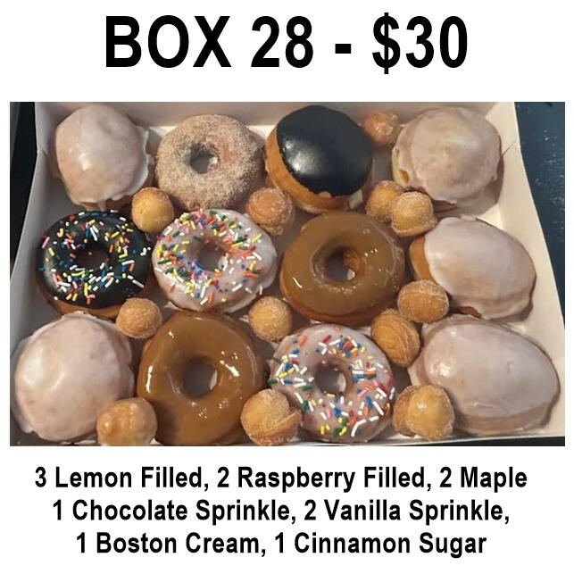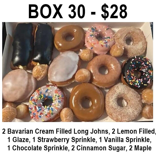 Party boxes include 15 donuts and 20 donut holes or 20 donuts.